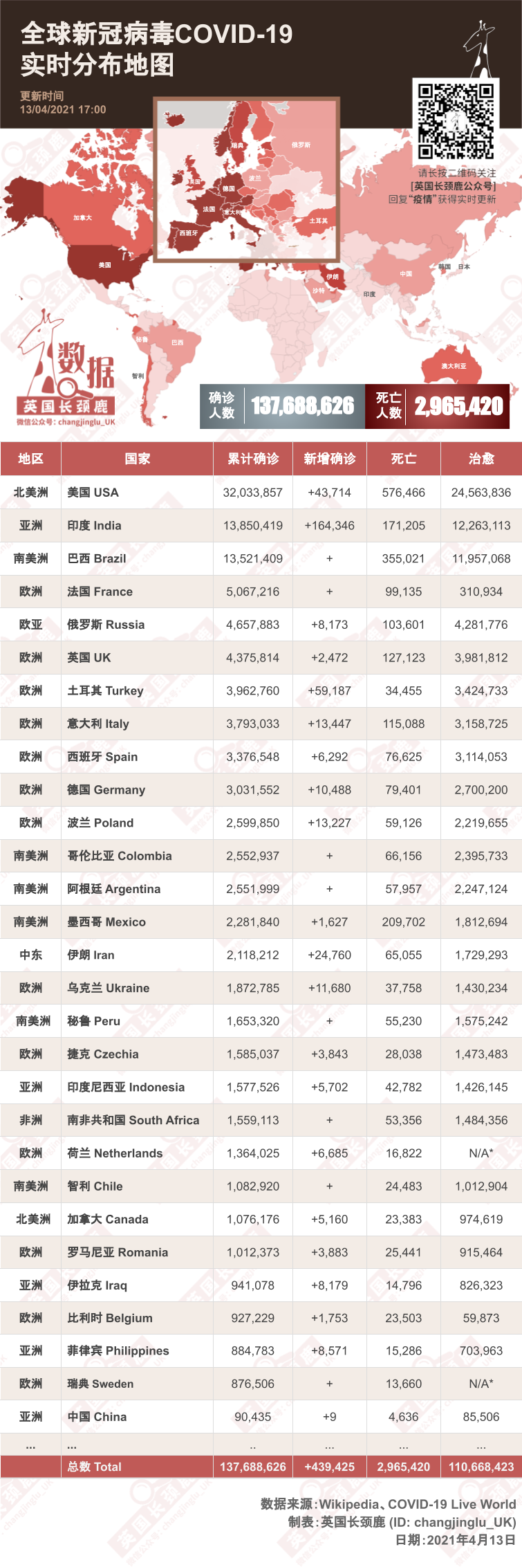 世界的累计确诊人数截止4月13日17:00超过13,768万例(*),死亡超过296.5万例(+11k)。