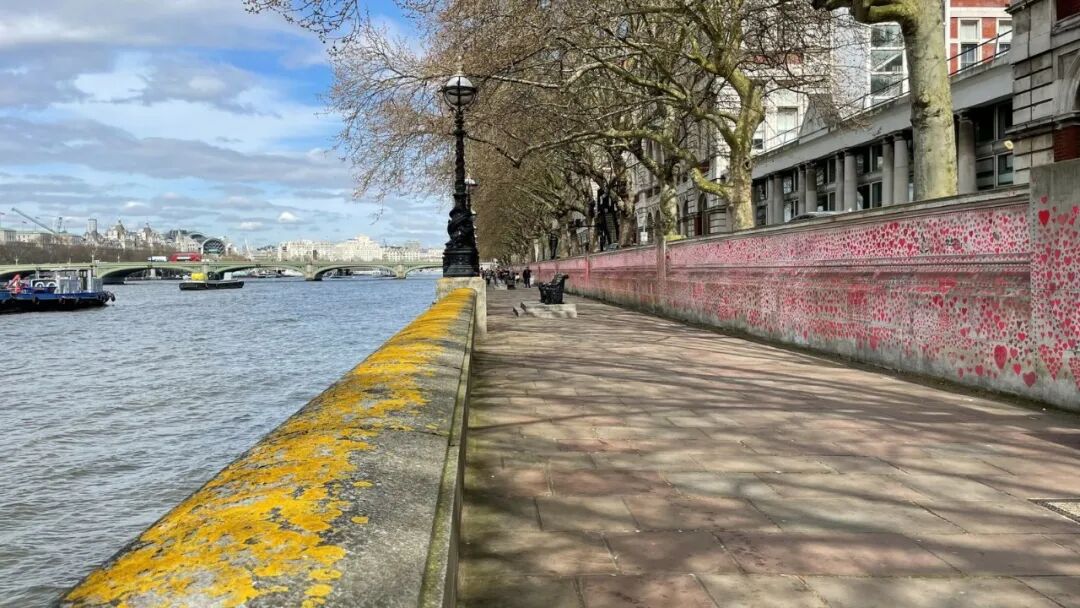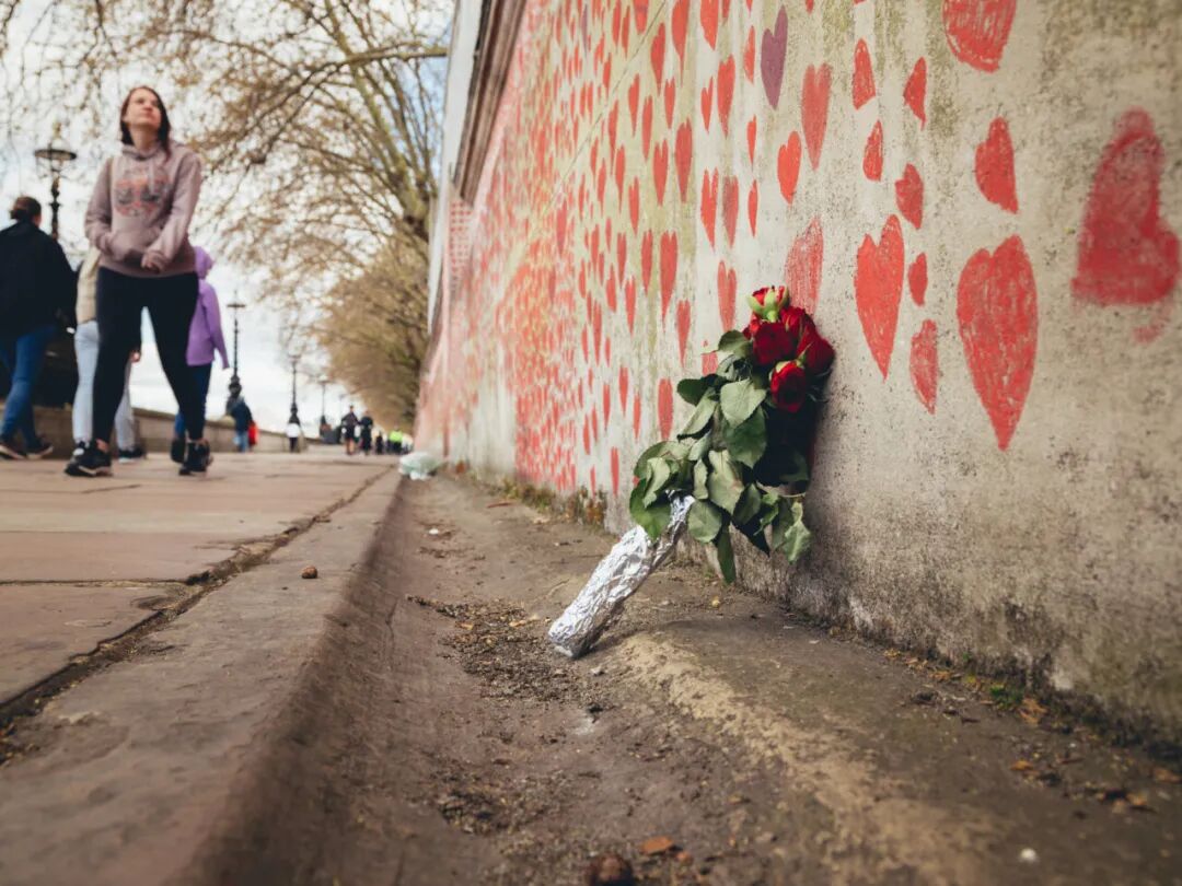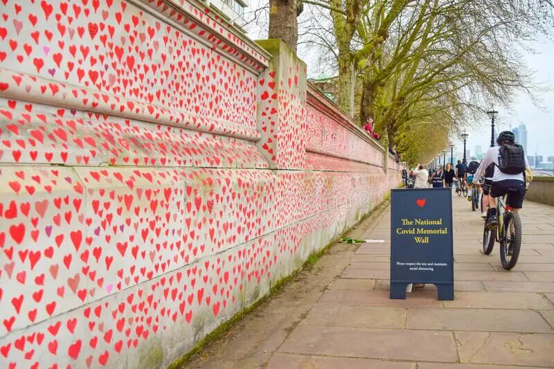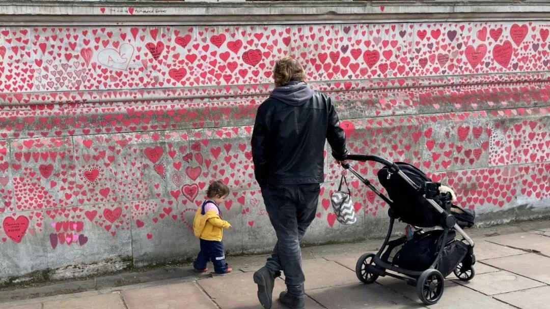 威斯敏斯特宫(the Palace of Westminster)对面,沿着伦敦泰晤士河南岸,这面延伸了三分之一多英里(约540米),为纪念在英国新冠疫情去世的人而绘制的公共壁画——“英国国家新冠纪念墙”(The National COVID Memorial Wall),就位于圣托马斯医院(St Thomas' Hospital)外。