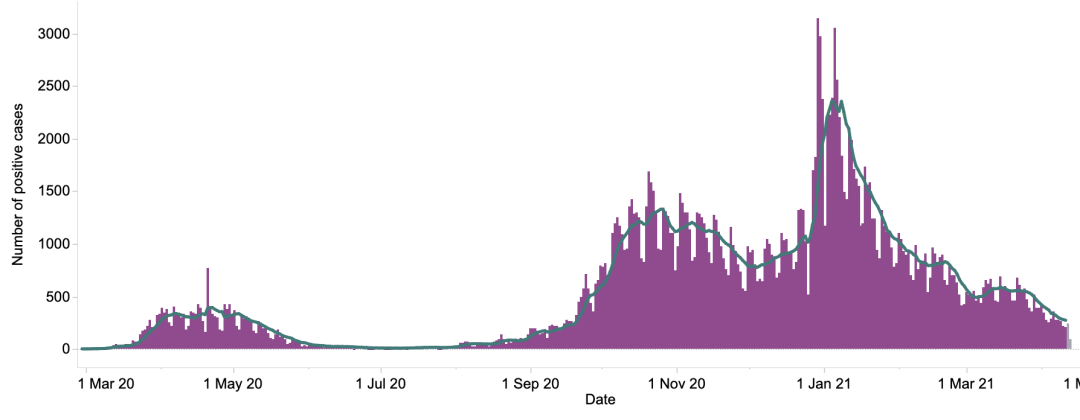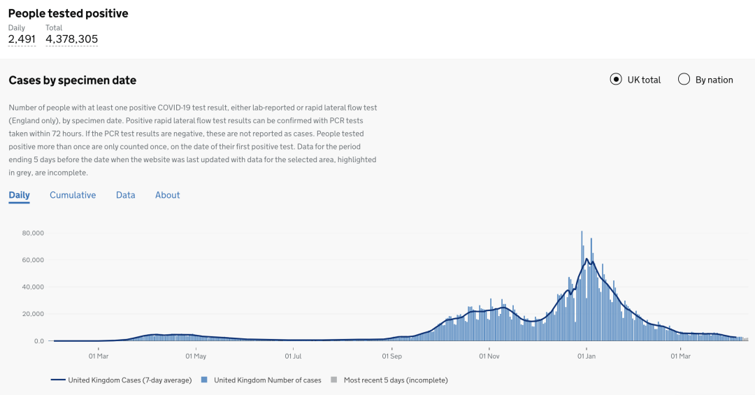 截止至2021年4月14日(周三)英国时间09:00,累计检测结果量135,152,009次(+679,109);累计确诊4,378,305例(+2,491);累计病亡127,161例(+38)。