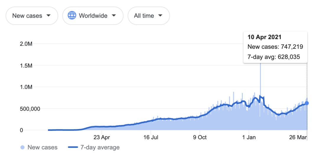 世界的累计确诊人数截止4月14日17:00超过13,768万例(+680k),死亡超过297.7万例(+12k)。