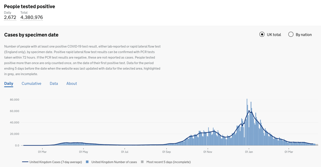 截止至2021年4月15日(周四)英国时间09:00,累计检测结果量136,363,617次(+1,162,840);累计确诊4,380,976例(+2,672);累计病亡127,191例(+30)。