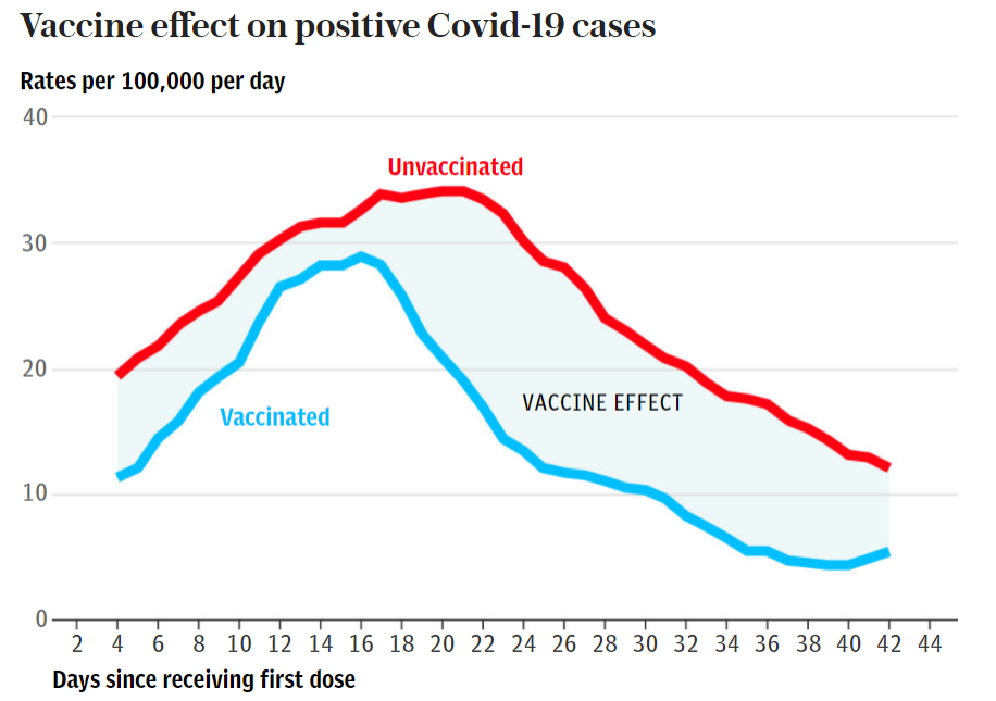 结果显示,首次接种辉瑞(Pfizer)疫苗后35至41天内,80至83岁的老年人与新冠相关的住院率下降了75%,新冠感染率下降了70%,阳性者从每10万人中的15.3例下降到4.6例。
