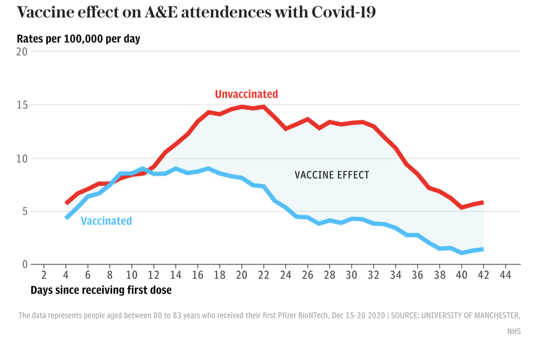 上周,曼彻斯特大学的一项研究发现,与同龄人相比,接种疫苗的80-83岁的老人在接种辉瑞疫苗5周后,新冠的入院率下降了近75%。
