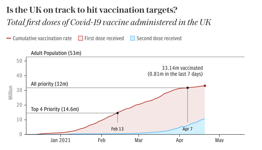 此外,截至目前,英国已有超过1,070万人完成了两剂疫苗的接种,这意味着1/5的英国成年人已经完全接种了疫苗。