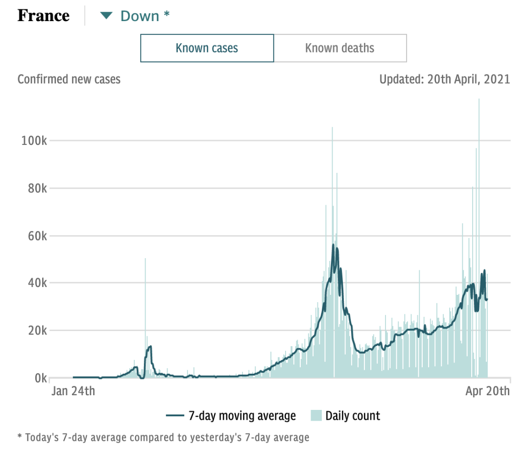 据悉,总统Macron马克龙希望日增确诊数在一个月内降至2万左右,并且将实现在5月中旬前为2,000万人接种至少一剂疫苗的目标。