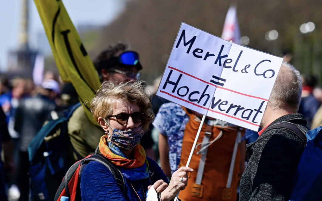 4月21日(周三),数百人在德国首都柏林抗议议会即将通过的一项法律,该法律将赋予国家政府对新冠病毒感染率高的地区和州实施封锁的权力,以遏制第三波疫情。原来,该权力仅限每个州的当地政府。