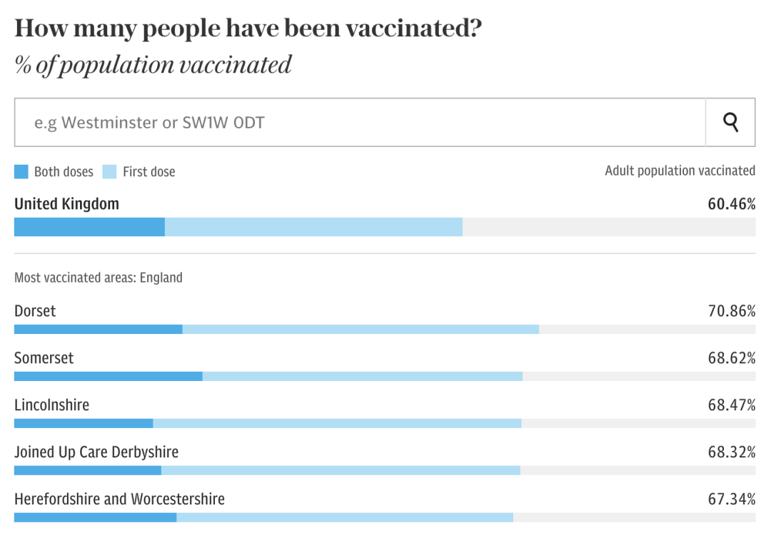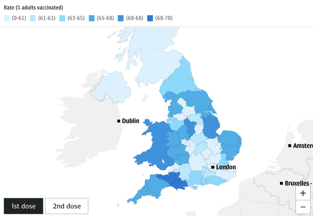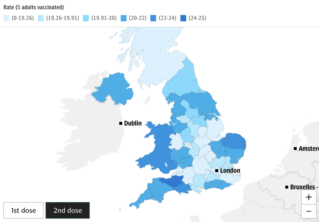 英国各地第二剂新冠疫苗的接种状况(颜色越深百分比越高)
