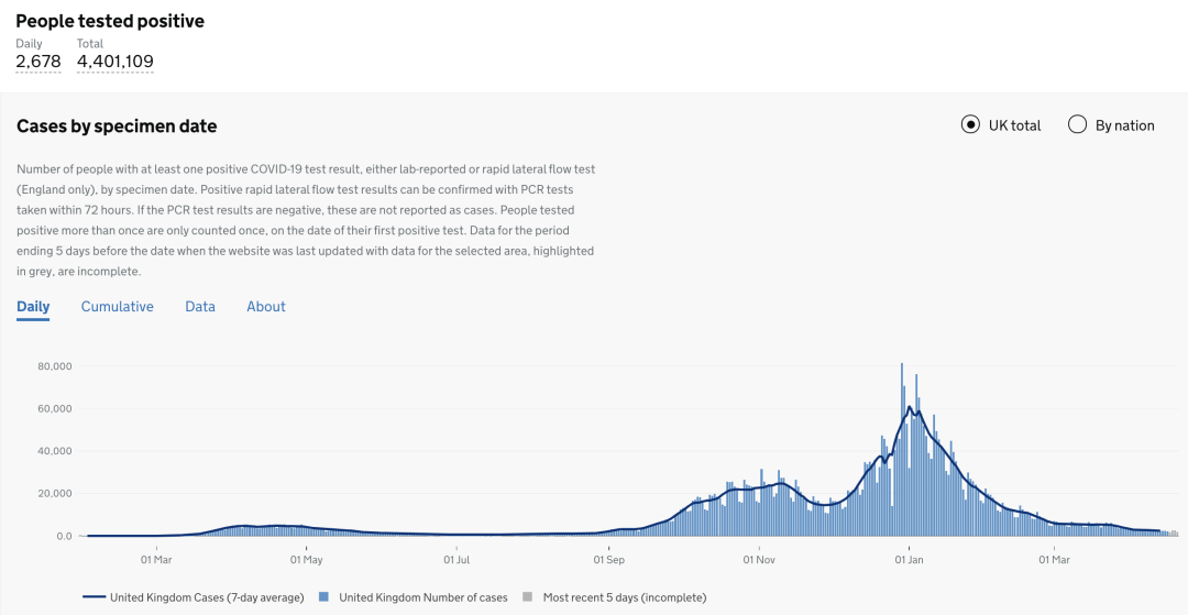 截止至2021年4月23日(周五)英国时间09:00,累计检测结果量143,949,153次(+1,111,876);累计确诊4,401,109例(+2,678);累计病亡127,385例(+40)。