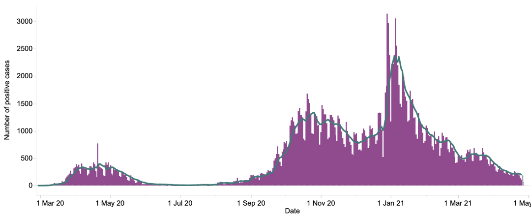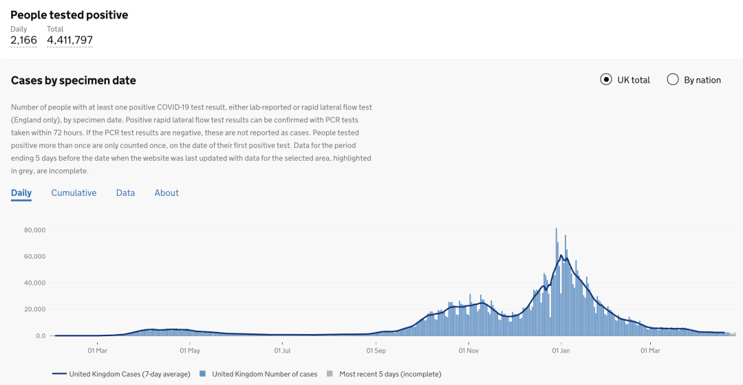 截止至2021年4月28日(周三)英国时间09:00,累计检测结果量150,101,360次(+730,262);累计确诊4,411,797例(+2,166);累计病亡127,480例(+29)。