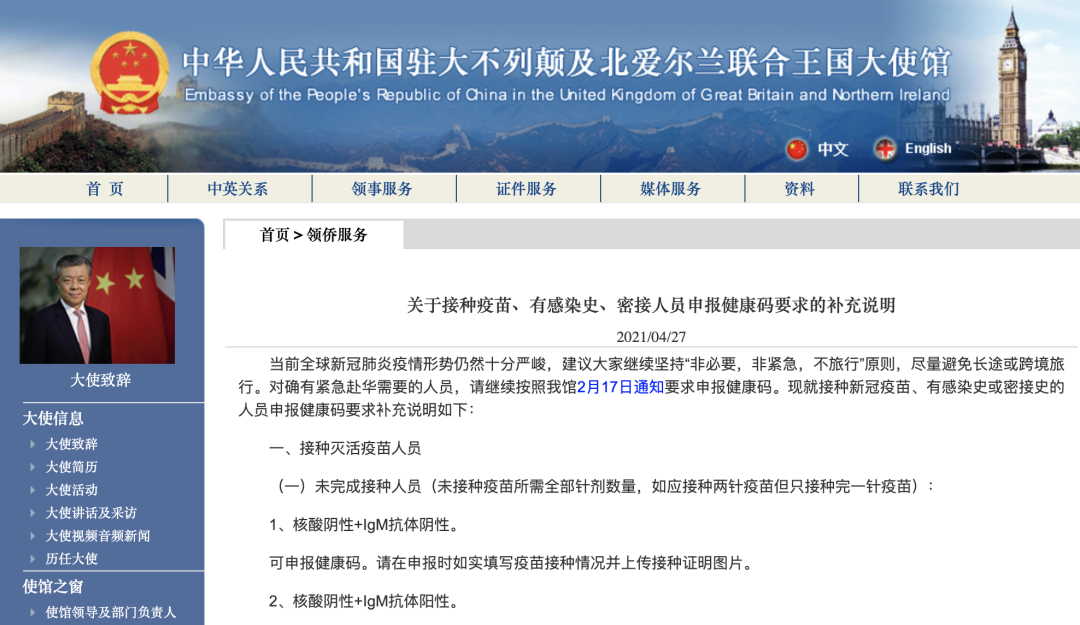 4月27日(周二)晚,中国驻英大使馆官方发布了《关于接种疫苗、有感染史、密接人员申报健康码要求的补充说明》
