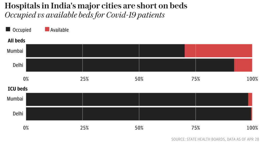 至今,在印度的许多城市,医院的床位仍旧不够用,病人的亲属更是挤在药店和药品供应商门外购买药品和氧气瓶。