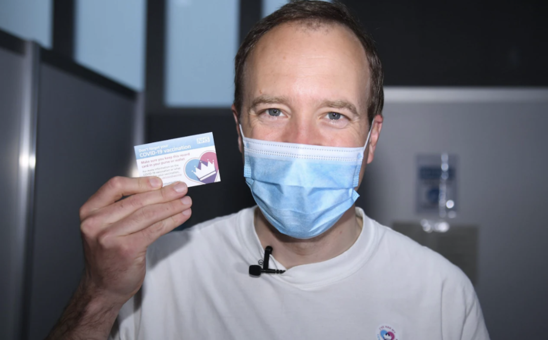 今日,42岁的卫生部长Matt Hancock在伦敦市中心的科学博物馆处也接种了他的首剂疫苗,帮他接种的是英格兰副首席医疗官JVT。