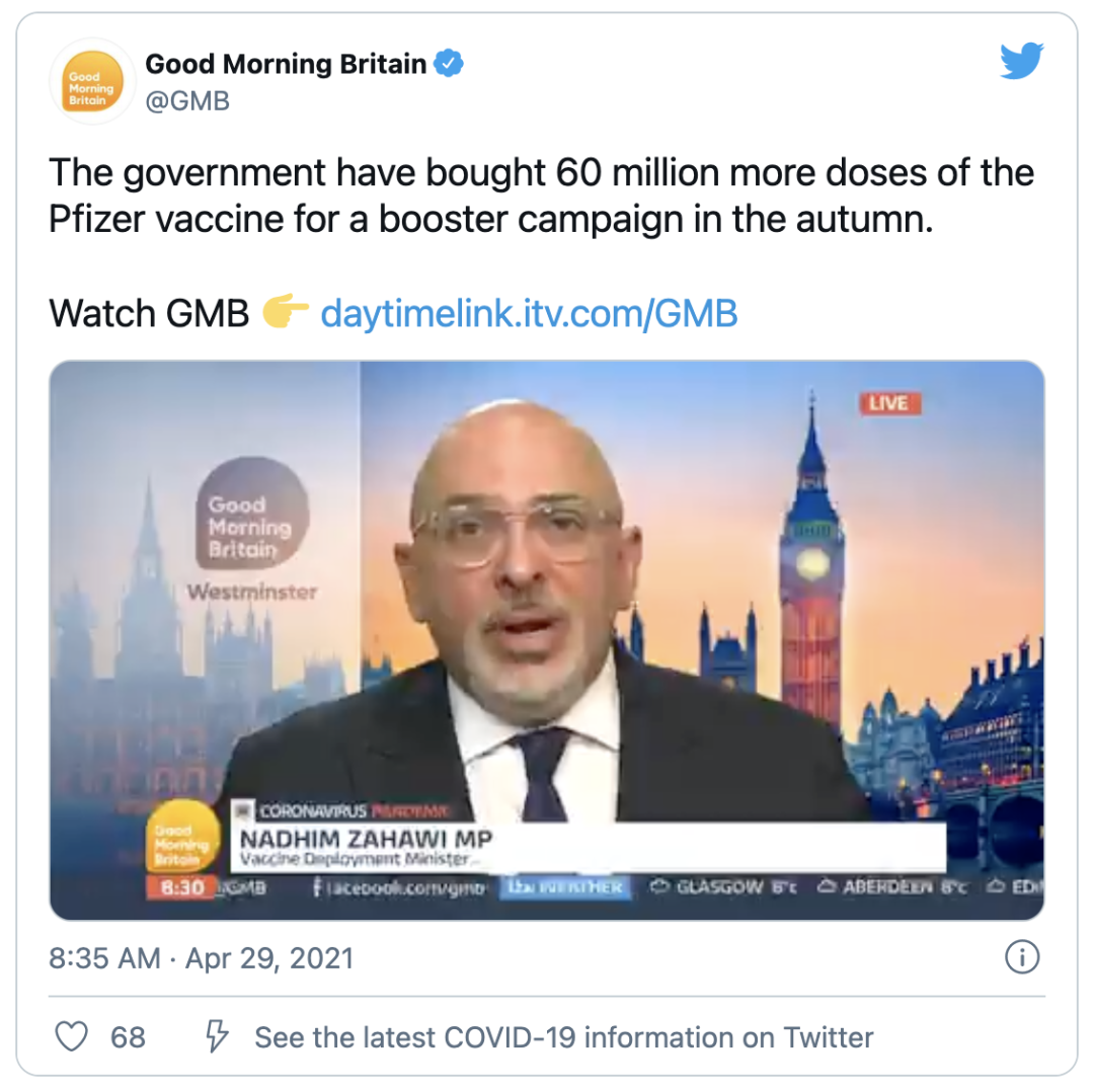 4月29日(周四),英国疫苗部长Nadhim Zahawi表示,科学家和临床医生将做出决定:英国政府额外购买的6,000万剂辉瑞加强型疫苗可能意味着每个成年人都能在秋季获得第三剂补充剂量——这是未来疫苗接种强化推广活动的一部分。