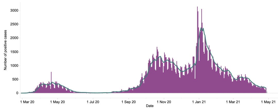 此外,最新的NHS检测追踪数据显示,在截至4月21日的一周里,共进行了963,000次PCR核酸检测,英格兰共有16,776人的新冠病毒检测呈阳性:该数据比前一周下降了9%,也是英格兰自9月2日结束的一周以来记录的最低病例数。