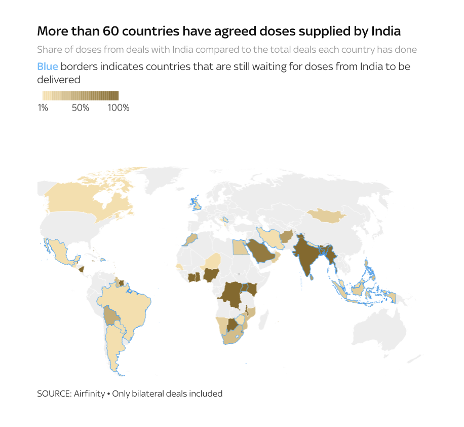 目前,世界各地正在紧锣密鼓地推广疫苗接种活动,而每五剂疫苗中其实就有一剂是在印度制造的——该国是向世界其他地区出口新冠疫苗的最主要国家,占疫苗总出口量的近30%。