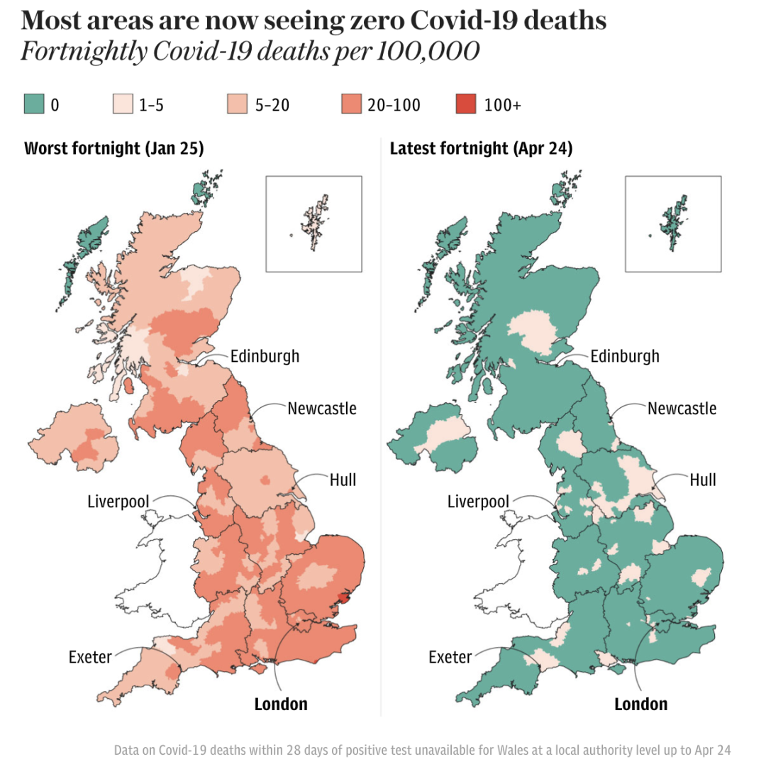 此外,4月一整月,新增新冠病亡人数不到600人,而在1月的前四周,死亡人数超过了3万人——这些数字表明,英国疫情正在进入一个新的阶段,许多地区的冠状病毒水平很低。