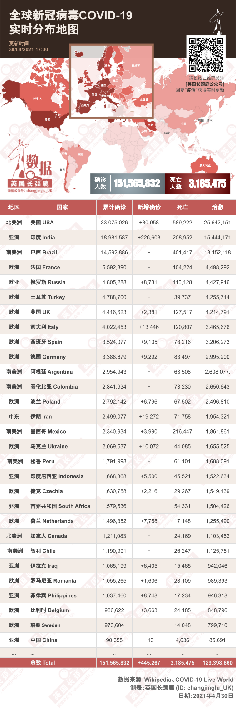 世界的累计确诊人数截止4月30日17:00超过1亿5,156万例(+910k),死亡超过318.5万例(+17k)。