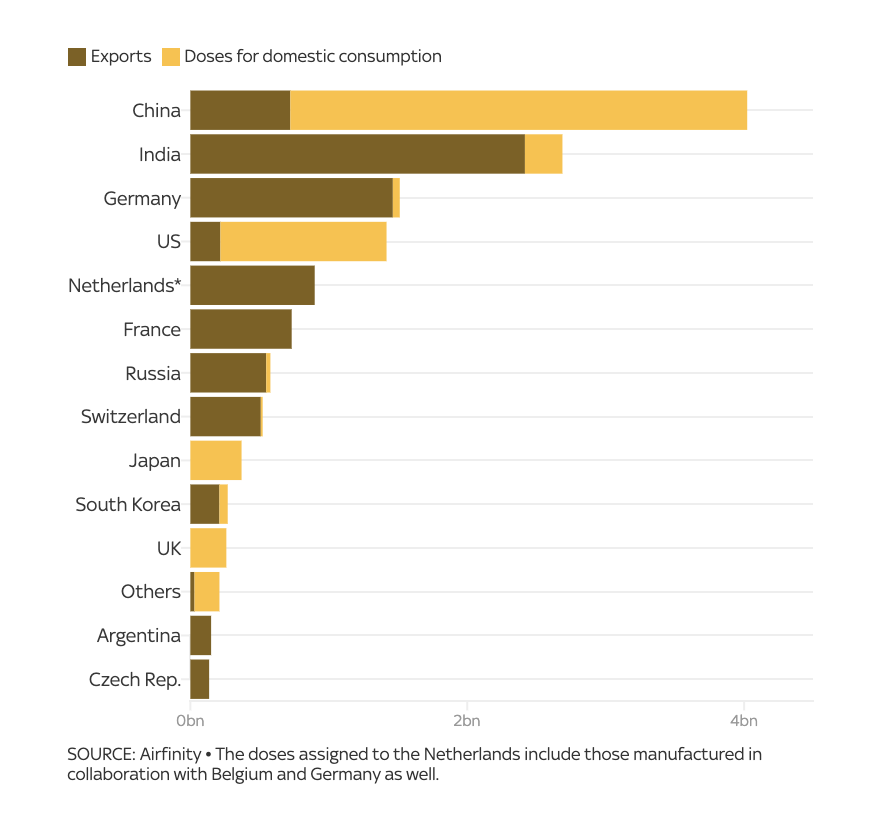 但并非所有国家都出口自己制造疫苗,比如英国和日本是前几名中唯一不出口疫苗的国家;而在最大的疫苗生产国中,中国和美国分别只有18%和15%的剂量供出口。