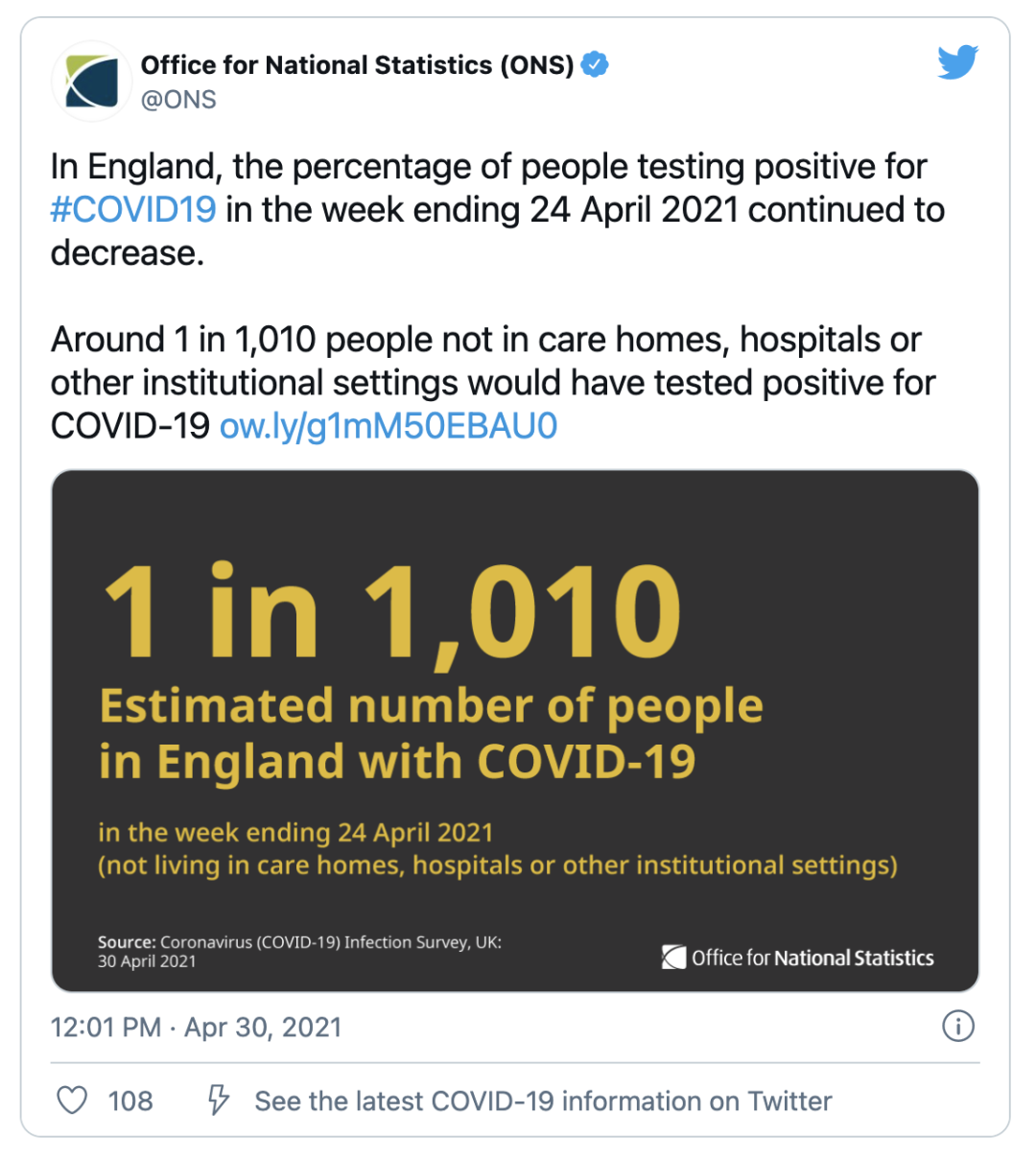 国家统计局ONS的最新数据显示,英格兰只有大约1/1000的人患有新冠,这相比1月第二波高峰阶段下降了足足20倍。