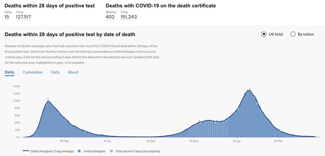 4月30日(周五),官方表示:在英国超过一半的人所生活的地区在过去两周内0新增新冠死亡案例。