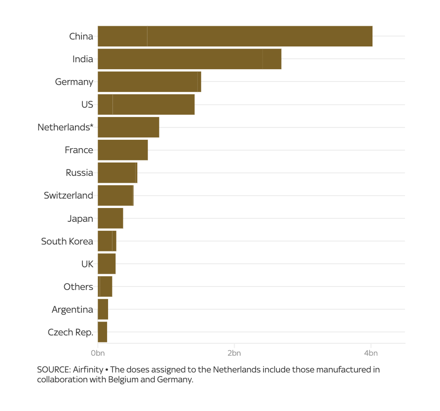 目前,全世界主要生产疫苗的国家为中国、印度、德国以及美国——这四个国家将提供迄今商定的137亿剂总产量中的70%;而其余的剂量将由16个国家供应,包括英国在内。