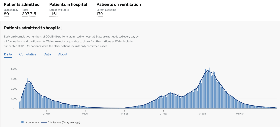 英国全境截至今日,已接种第1剂疫苗共34,346,273人(+130,186);已接种第2剂疫苗共14,940,984人(+408,109)。