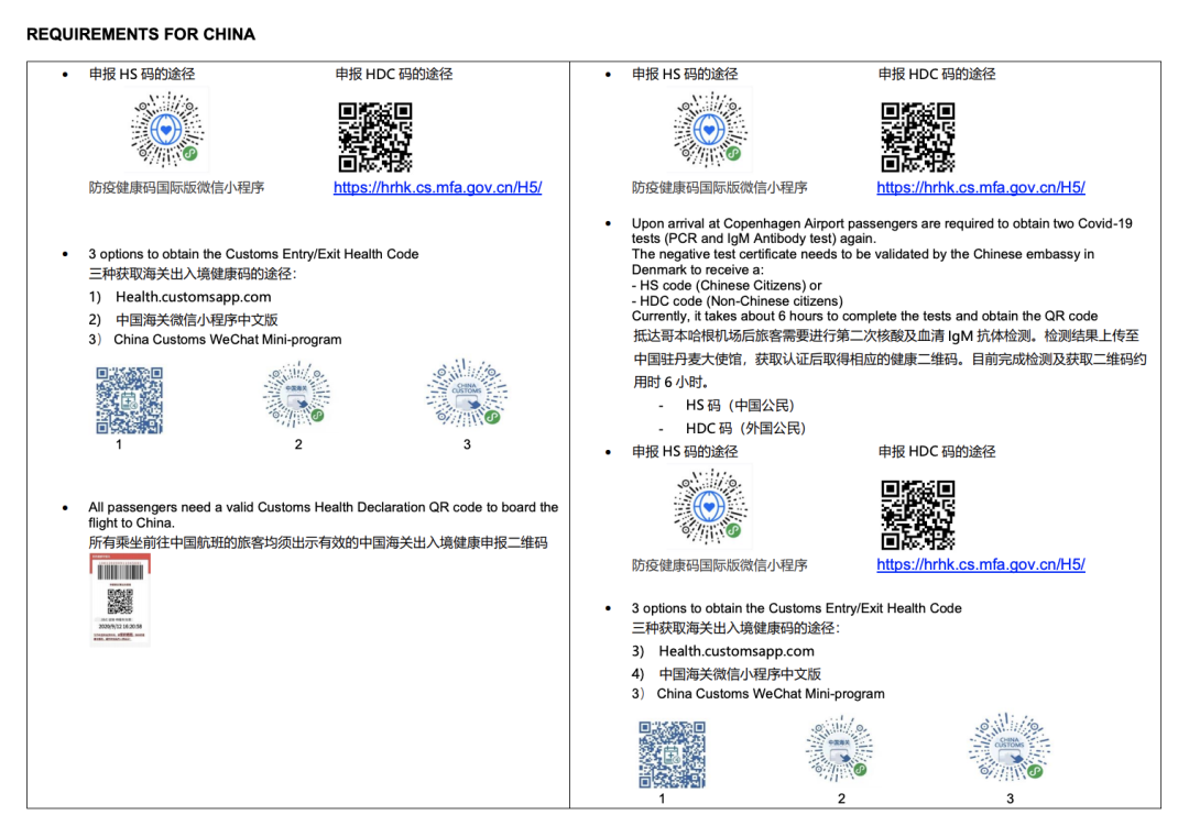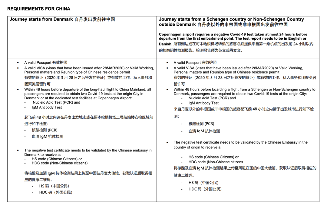 此外,根据丹麦当局的最新规定,自5月1日起,年满13岁及13岁以上的旅客,自中国前往丹麦或在哥本哈根机场转机,在上海登机前必须提供出发前48小时以内的核酸阴性检测报告,检测报告须为英文或丹麦文。