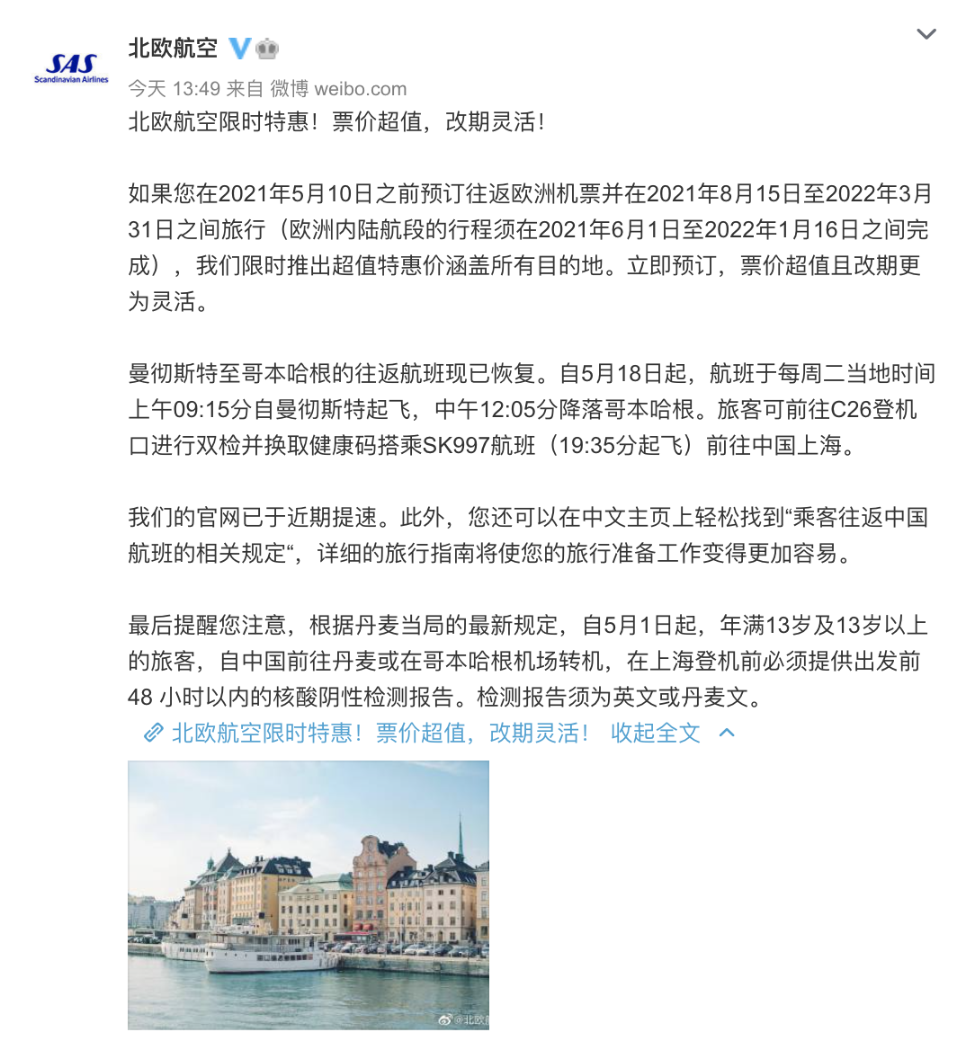 5月6日(周四),北欧航空发布了最新消息:官方运营的上海至哥本哈根往返的定期航班,现推出限时特惠!