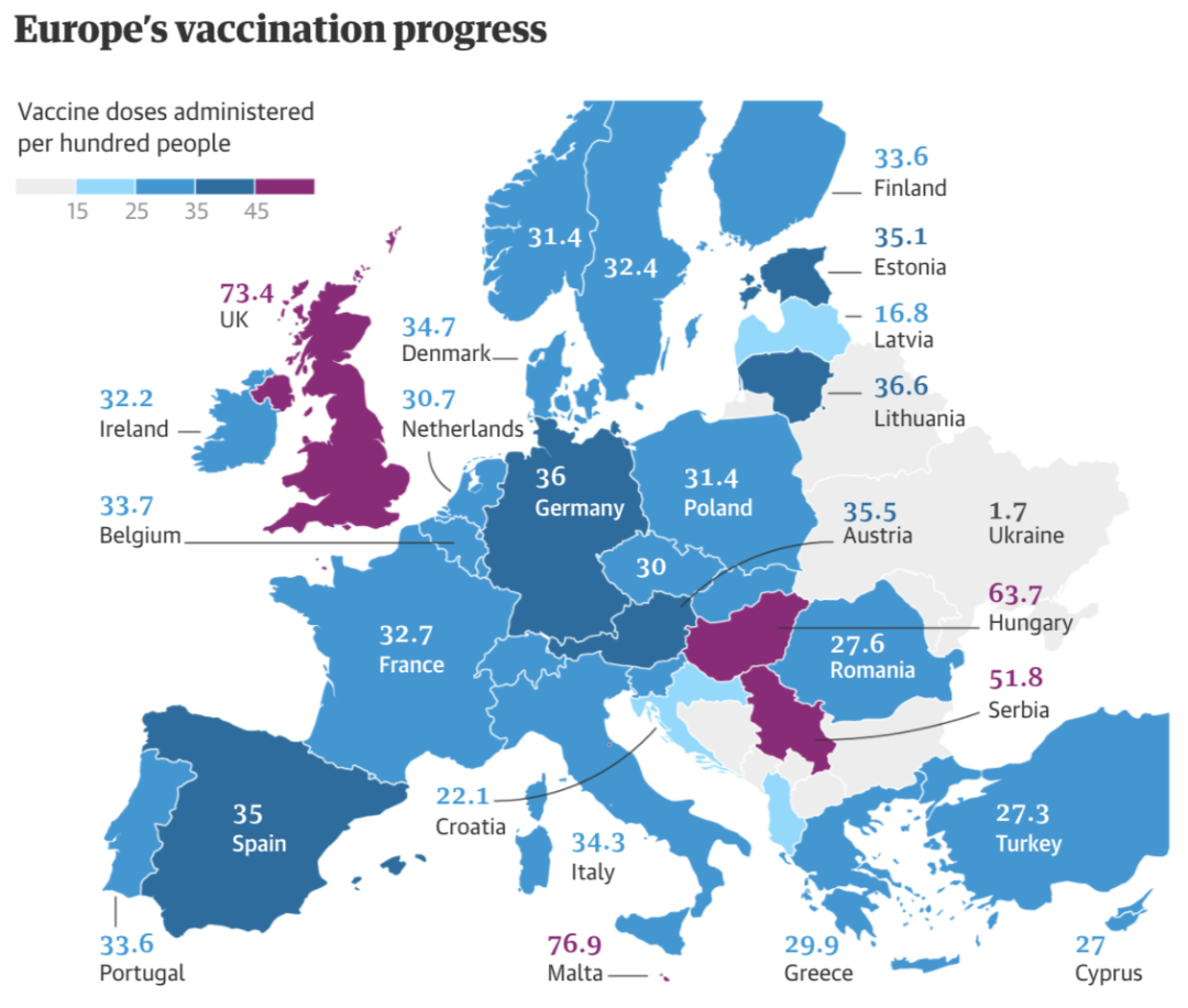 相比之下,西班牙、奥地利、德国、爱沙尼亚立陶宛的疫苗接种推广计划速度也进展飞快——目前在这些国家当中已经有35%成年人接种了首剂疫苗。