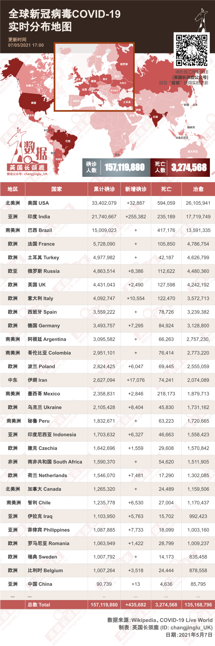 世界的累计确诊人数截止5月7日17:00超过1亿5,711万例(+830k),死亡超过327.4万例(+13k)。
