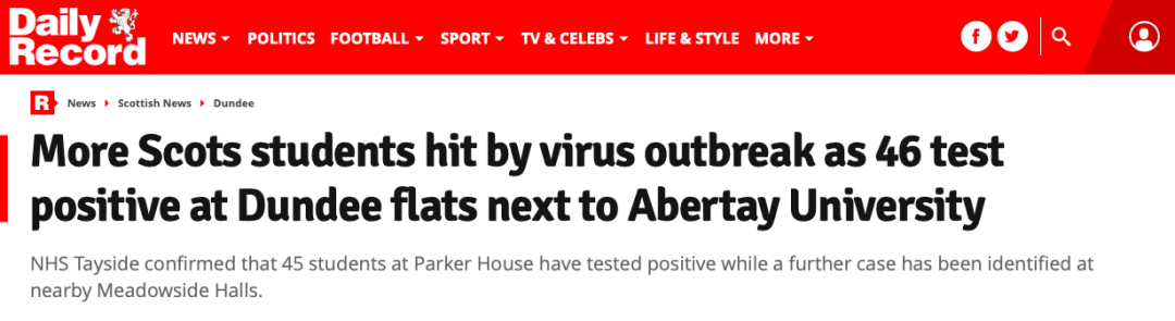 阿伯泰大学与邓迪大学校区附近的Dundee宿舍确诊病例已飙升至46例。据悉,确诊人员并非全部是大学学生,该宿舍的数百人目前处于自我隔离状态。
