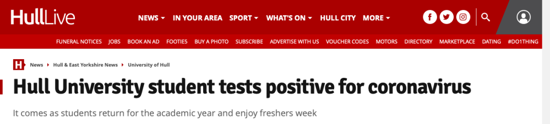 赫尔大学一名学生检测呈阳性,目前尚不清楚该名学生是在校园内或校外居住。