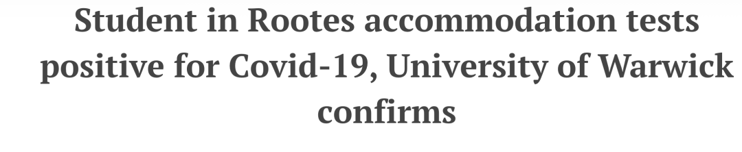 华威大学通过自己的检测和追踪系统确认了一名住Rootes的学生确诊新冠。原因是在9月13日(星期日)Rootes宿舍外有“非法聚会”。这名确诊者曾去过体育馆和部分学校场所。
