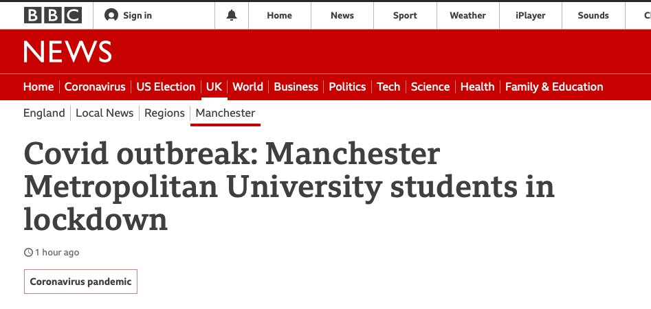 尽管官方要求有「六人以上禁令 Rule of Six」,曼彻斯特大学几十名学生被拍到在宿舍外狂欢过夜。
