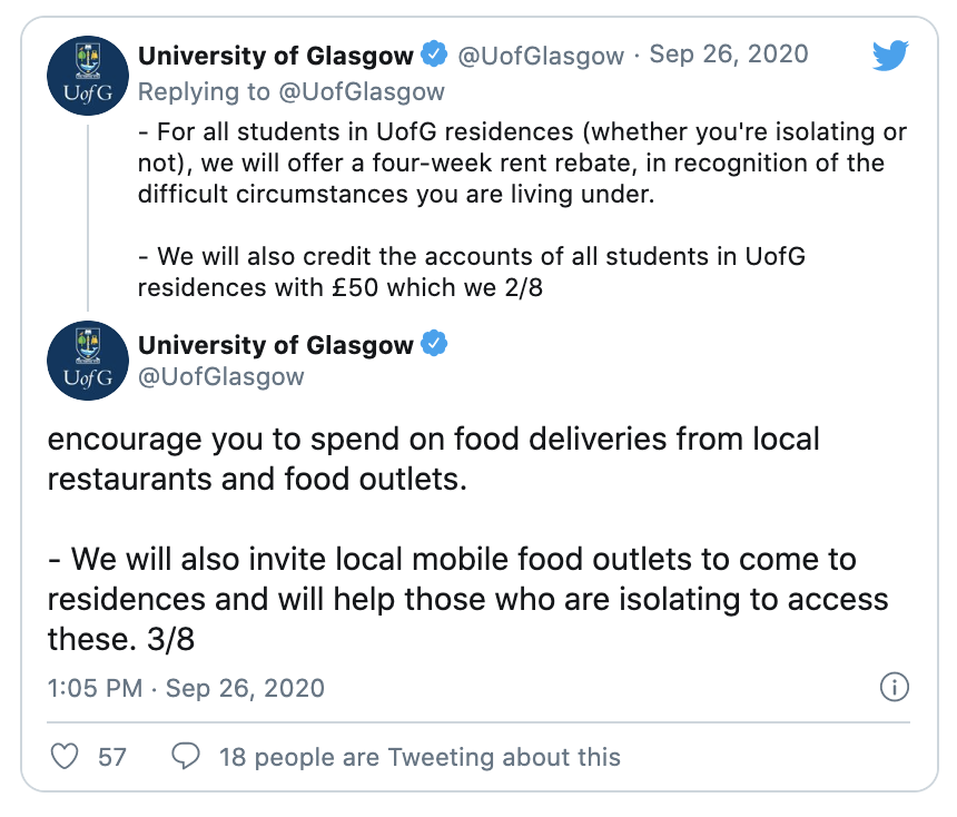 因格拉斯哥大学的疫情已导致172名学生检测呈阳性,600人正在隔离。该校宣布为更好推行隔离计划,减少社交,将向所有住在大学宿舍的学生(无论是否被要求自我隔离)提供四周房租折扣优惠和£50的食物补贴费。