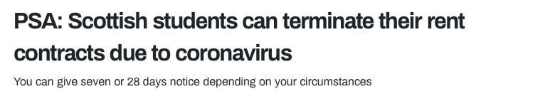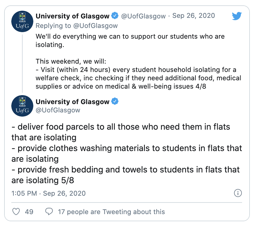 根据学校学生的描述,大学的隔离相当严格——食物直接被放在门口;要求在浴室里面洗衣服(禁止出门所以无法使用公共洗衣房);有的甚至被要求必须呆在卧室。在苏格兰,所有学生都被禁止前往酒吧。