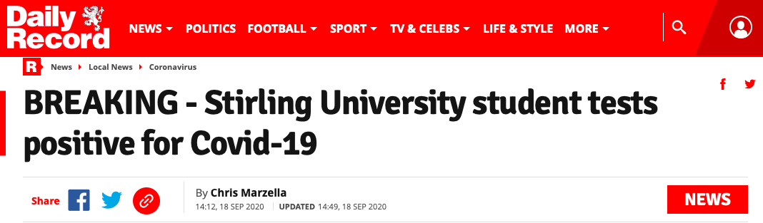 斯特灵大学已经确定一名学生的冠状病毒检测呈阳性,该学生确诊时处于自我隔离状态。没有与其他学生、工作人员或“更广泛的社区”有过直接接触。