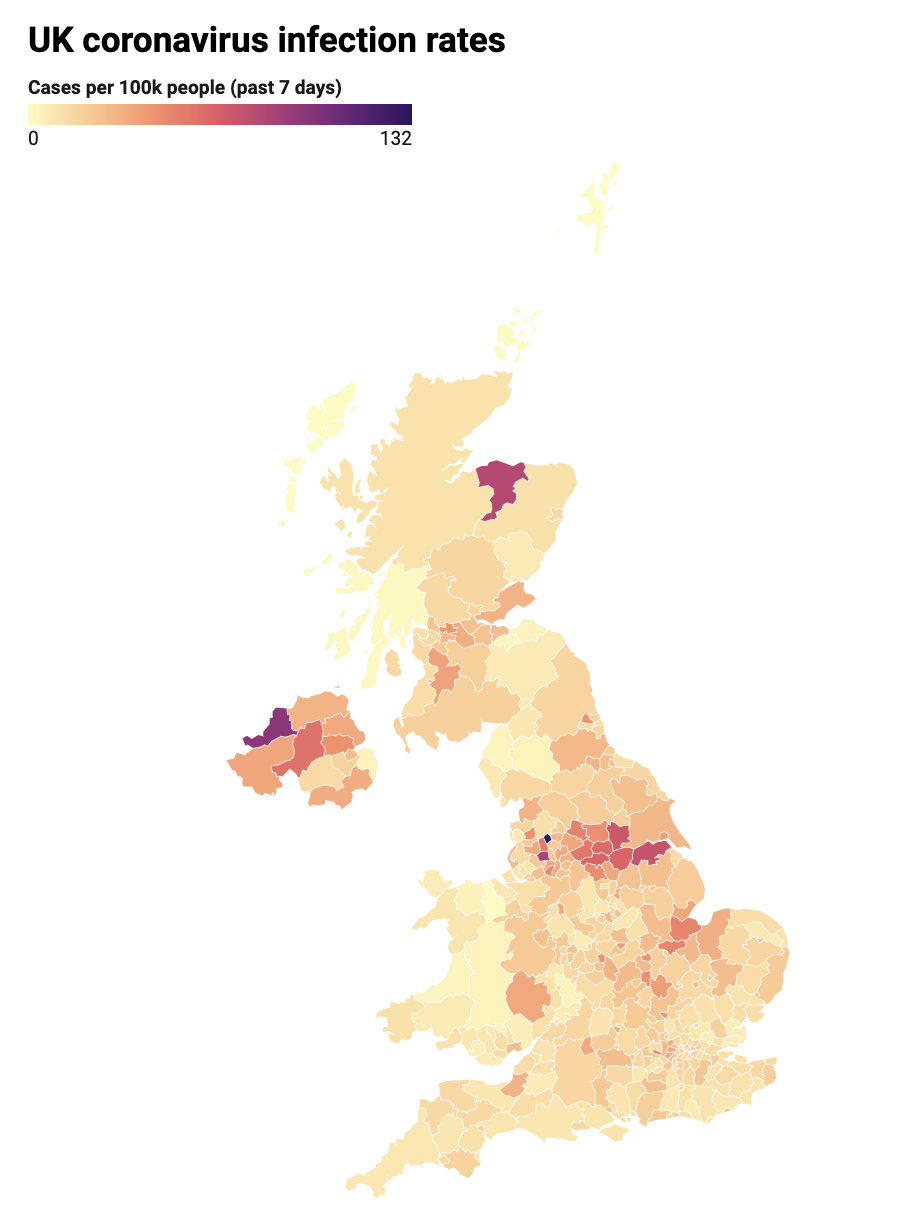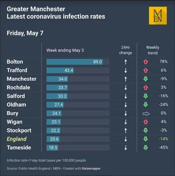 尤其是在曼城旁边的Bolton——该市在英格兰新冠印度变体感染率最高的地区排名中位列第二:在截至5月1日的一周内,该市新增确诊245例。据官方表示,这与当地印度人群体比例高,之前从印度前往英国的人与之接触有关。