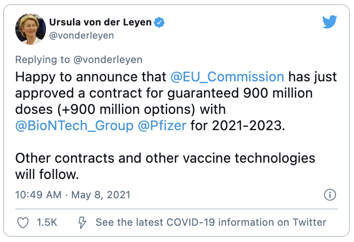 5月8日(周六),欧盟宣布:已同辉瑞BioNTech签署了一份新合同——将在2021年至2023年接收18亿剂辉瑞新冠疫苗。