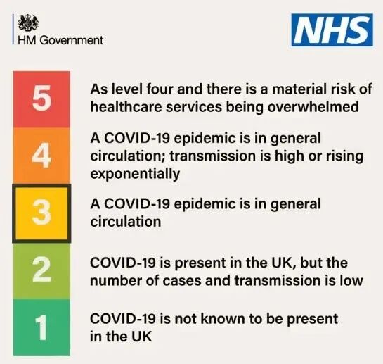 根据联合生物安全中心的建议,并考虑到最新的数据,英国首席医官和NHS英格兰国家医疗总监同意,英国的新冠警报级别应该从4级转为3级。
