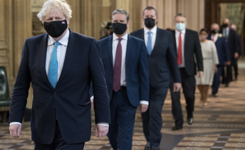 会议厅里有74人,包括女王、查尔斯王子、卡米拉、议长Lindsay Hoyle爵士、首相鲍里斯和反对党领袖Keir Starmer爵士、上议院和下议院的代表。
