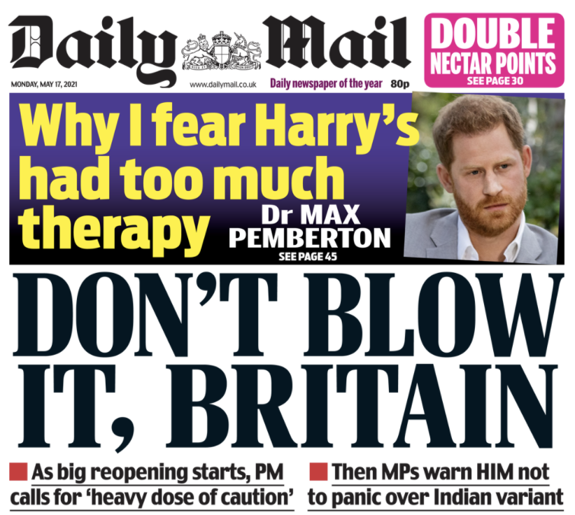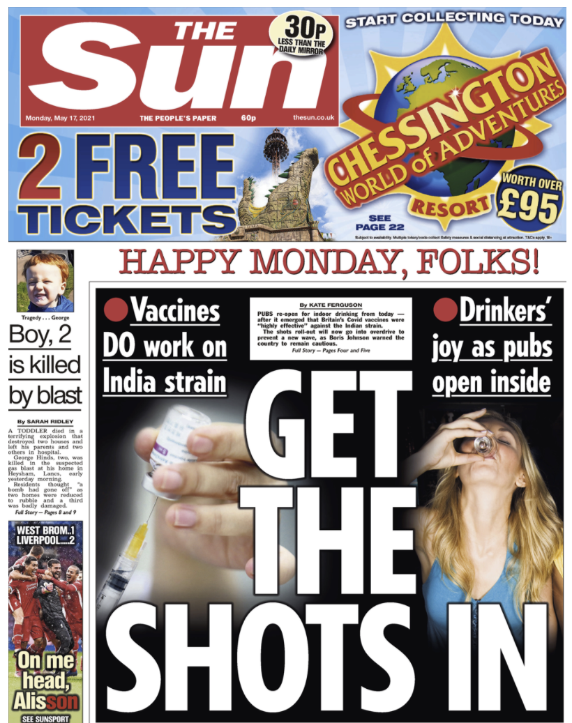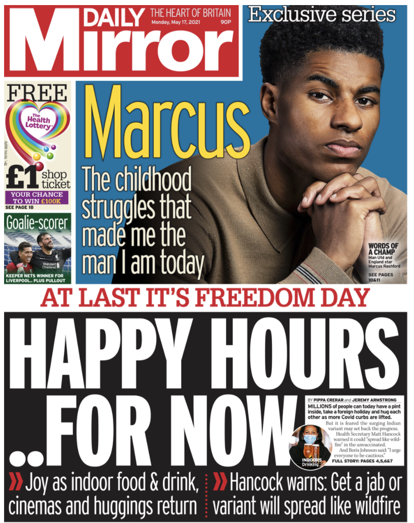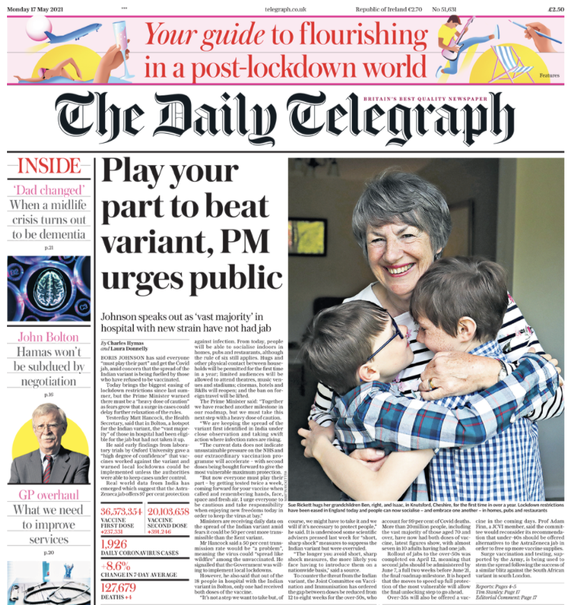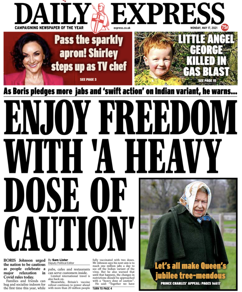 5月17日(周一),作为英国首日进入解封第三步骤,也是彻底解封前的最后一步,英国所有媒体报纸几乎一致认定解封是当天最大的新闻——他们都在头版头条上登出了有关解封的不同消息。
