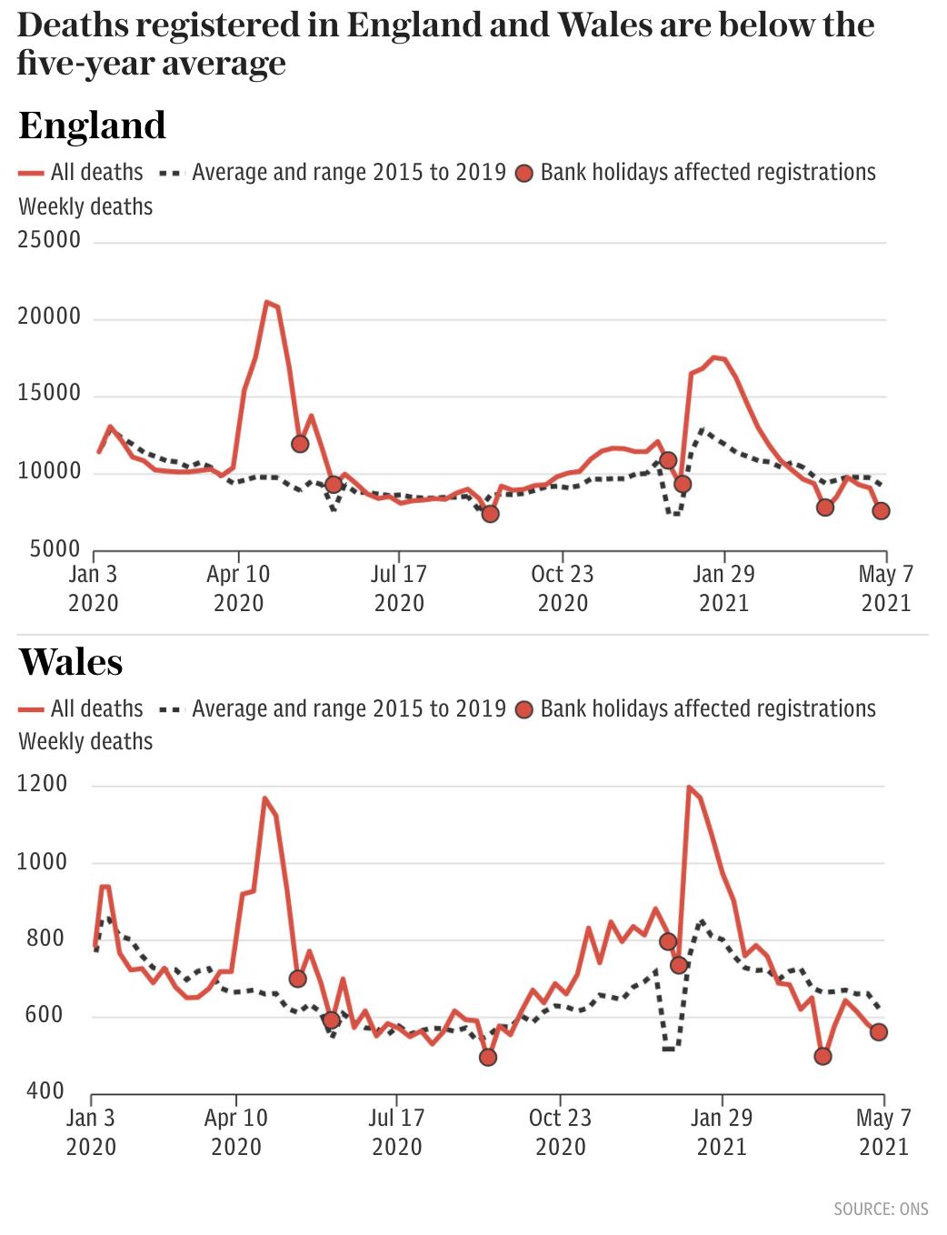 5月18日(周二),根据最新英国国家统计局ONS数据显示,英格兰/威尔士地区死亡人数目前低于5年平均值。