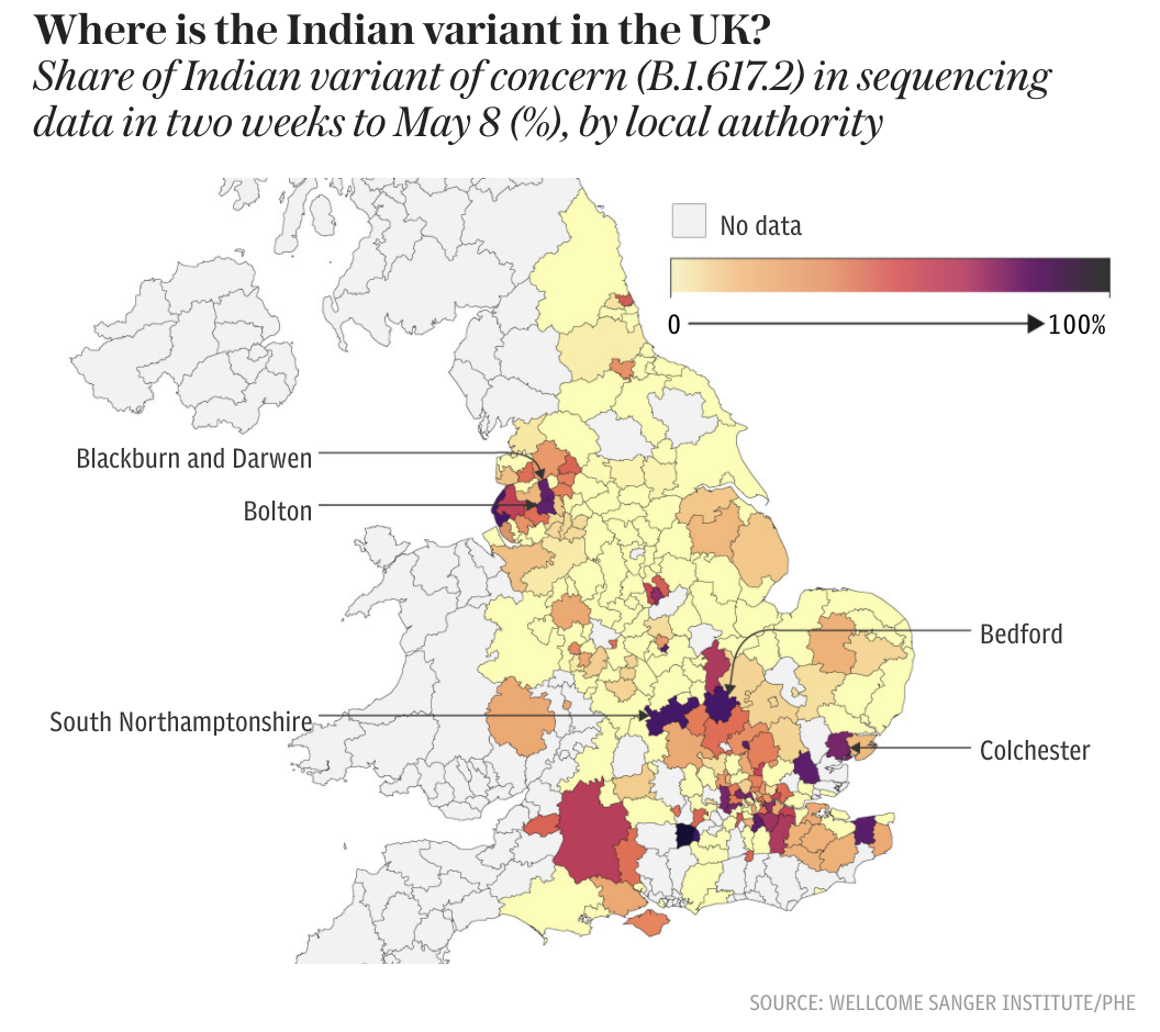 目前,英国86个地方当局现在发现了超过5种不同的印度变种病例,累计在英国总共发现了2,323个变种病例。