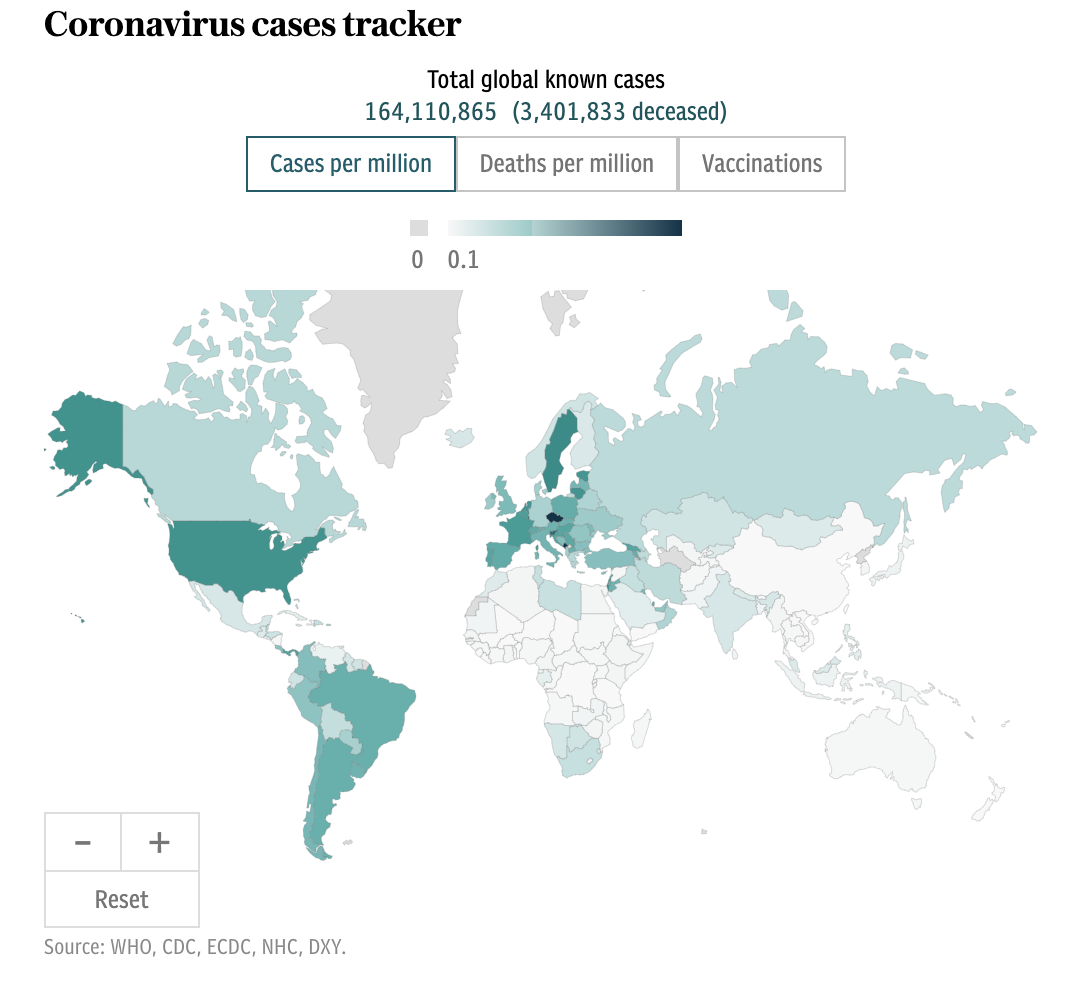 世界的累计确诊人数截止5月19日17:00超过1亿6,521万例(+680k),死亡超过342.3万例(+15k)。