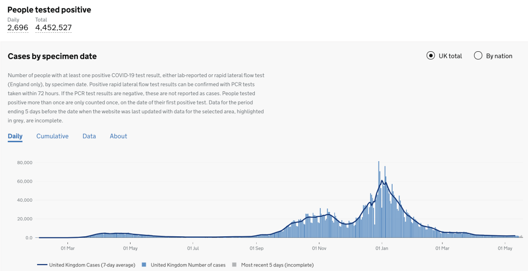 截止至2021年5月19日(周三)英国时间09:00,累计检测结果量168,404,482次(+732,012);累计确诊4,452,527例(+2,696);累计病亡127,694例(+3)。