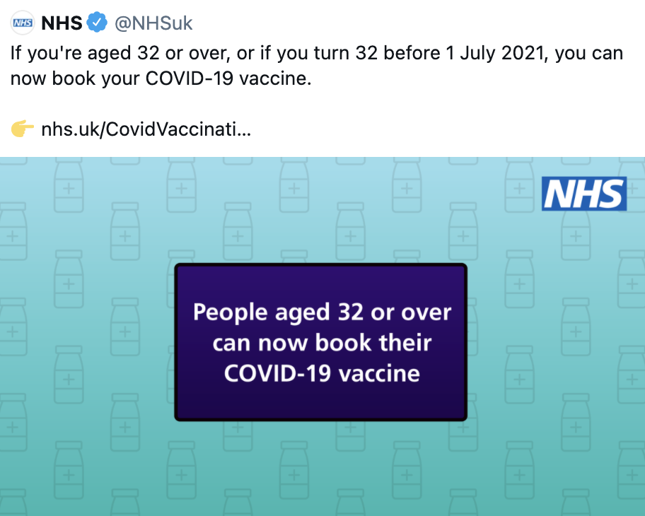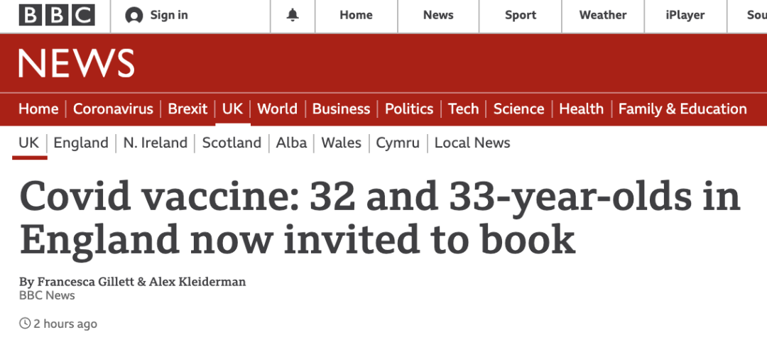 5月22日(周六),英格兰正式开始邀请32岁和33岁的人开始预订他们的第一剂新冠疫苗接种。今日上午,NHS向大约一百万人开放了疫苗预约。