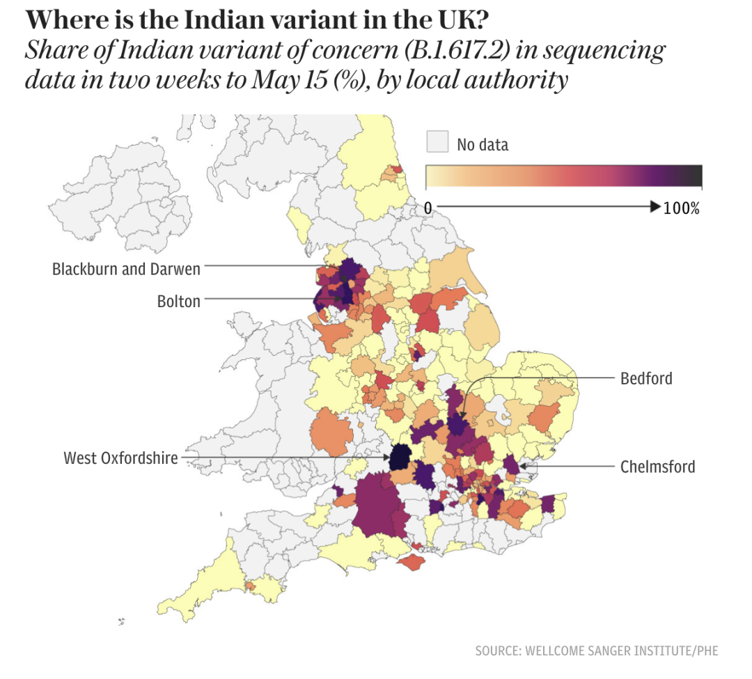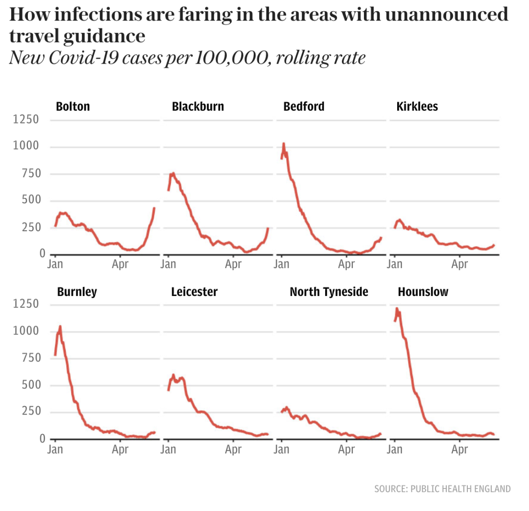 5月25日(周二),英国政府正式宣布了受印度变种影响最严重的八个英格兰地区,宣布进行局部封锁,并建议不要前往旅行,也不要从这些去前往其他地方,除非是工作、学习等必要的通勤旅行。