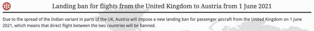 5月25日(周二),由于担心印度变种在当地的激增,奥地利已将英国列入其旅行的“红色名单”,并对从英国出发,直飞奥地利的航班实施了降落禁令。