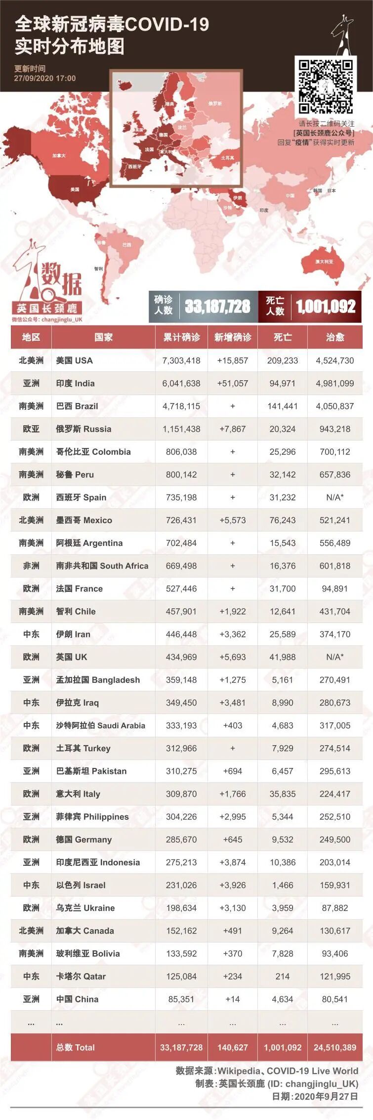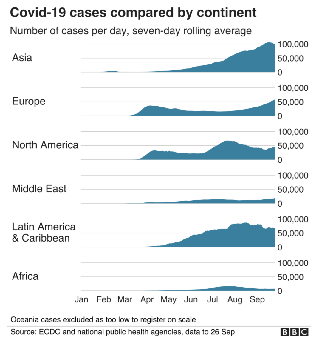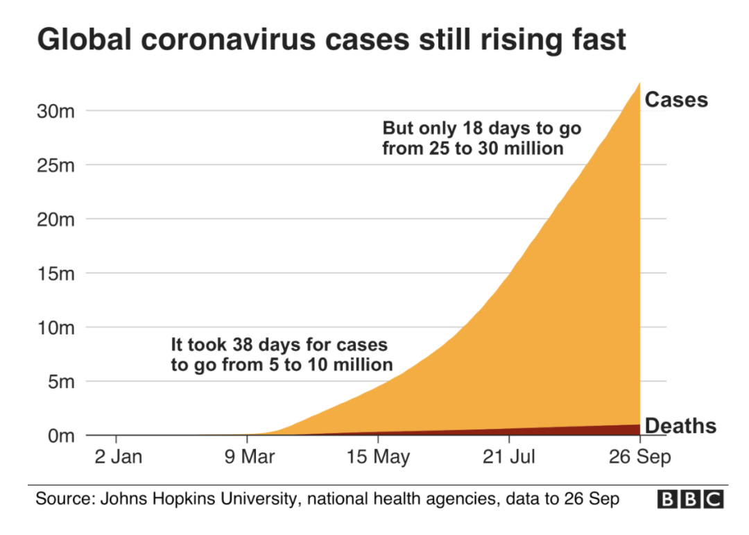 截至9月27日(周日),世界累计确诊新冠案例已经超过3,300万例;累计病亡超过100万例。